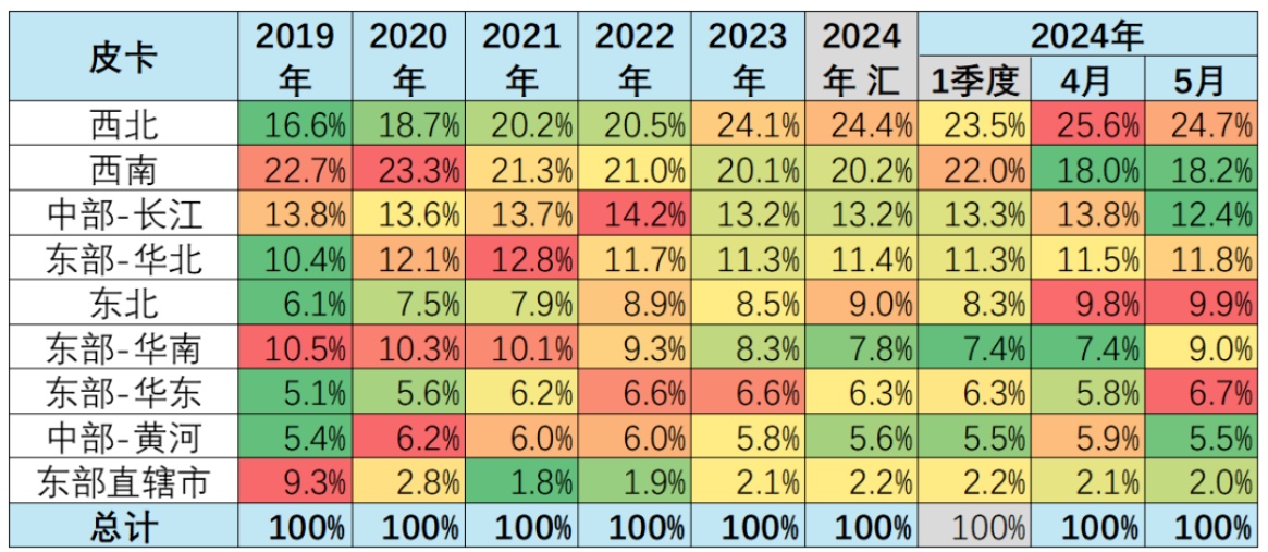 皮卡市场的主力区域以西北、西南为主,西部地区的皮卡需求较大。5月西北地区的皮卡需求表现较强。目前来看,西南、西北地区的皮卡需求占到总体需求的43%左右,成为两大核心市场,其中今年西南市场规模较大。
