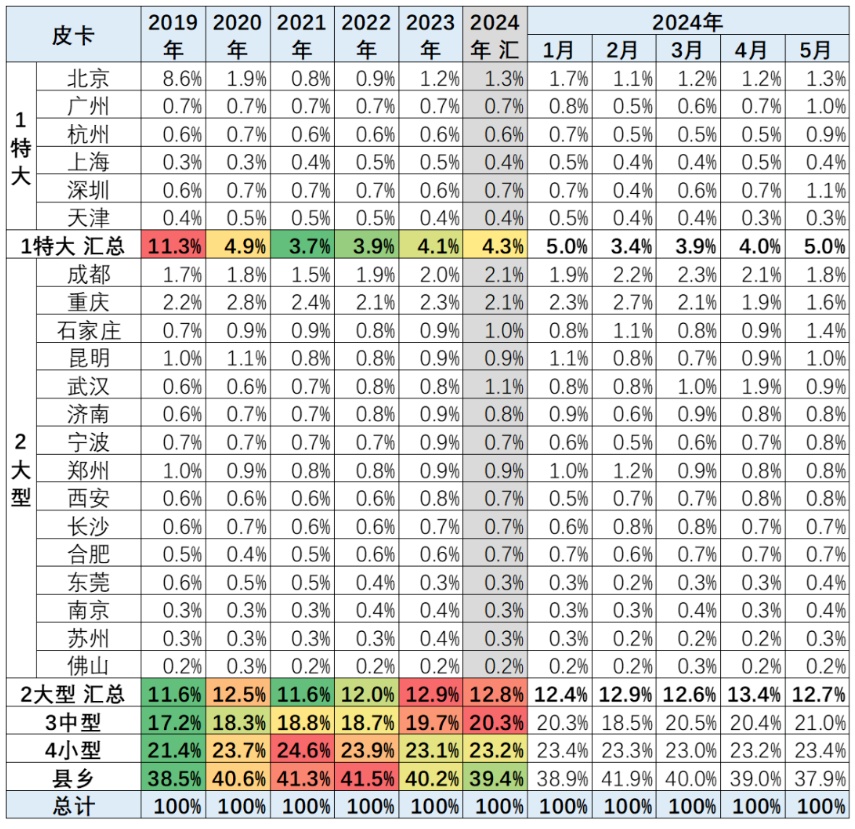 皮卡市场主力销售区域还是在以中小城市和县乡市场为主,但县乡市场春节前的表现相对来说还是偏弱。2024年5月中型城市和北京等限购市场表现较好。而县乡市场持续稳定,大城市市场目前来看并没有明显的突破特征。