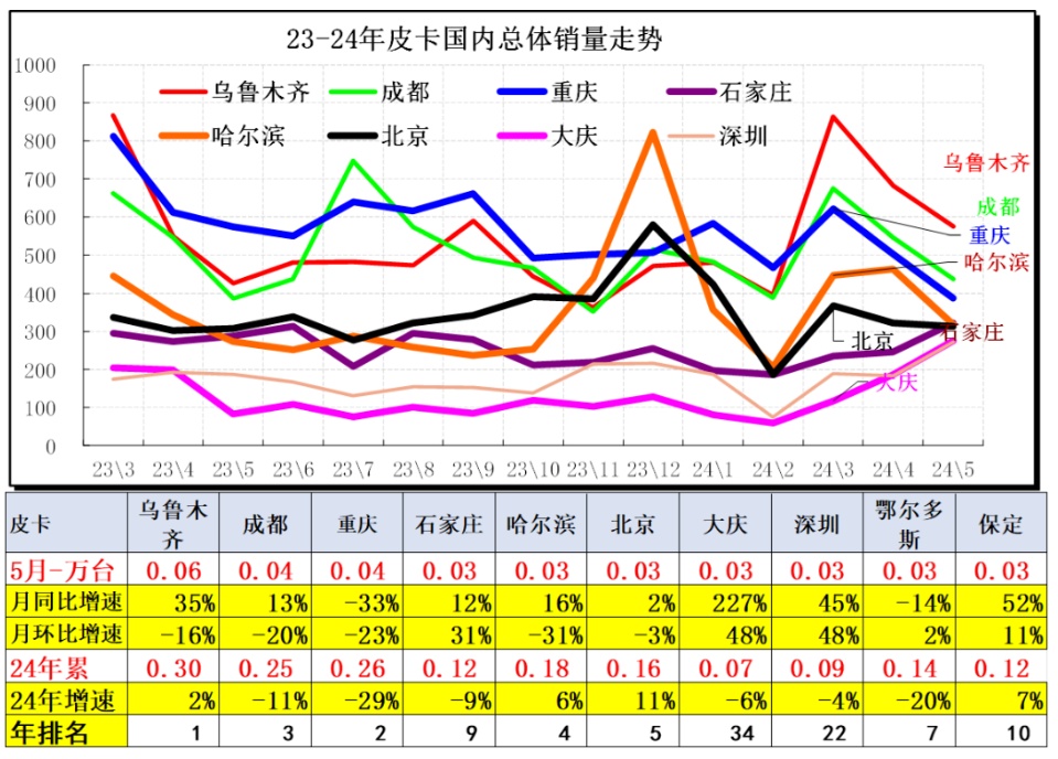 全国皮卡主力城市目前是乌鲁木齐、成都、重庆、石家庄、哈尔滨等西南、东北和西北地区。大城市需求有一定规模。鄂尔多斯、伊犁、呼伦贝尔等矿业和特色种植业主力地区的皮卡需求也很强烈。