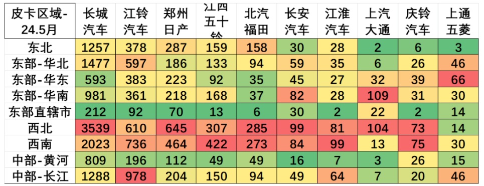 皮卡1超3强的总份额达到85%,其中江铃汽车在西南和长江流域表现较强;郑州日产在西北和西南地区很好;江西五十铃在西南和西北地区的表现很强。