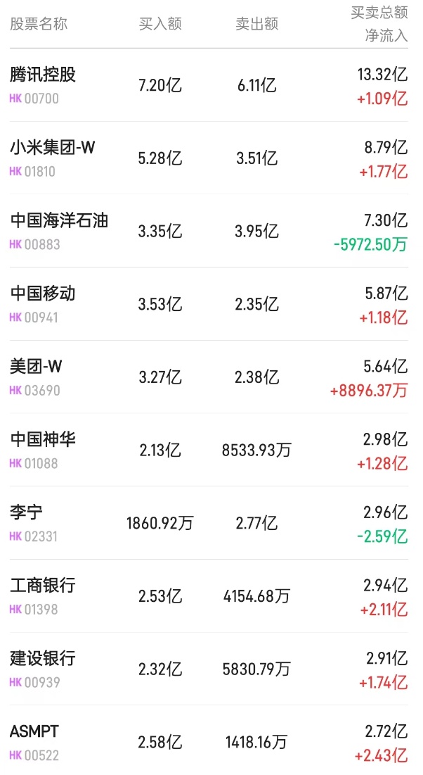 此外,小米集团-W(01810)获净买入3.72亿港元。而中海油(00883)、中芯国际(00981)分别遭净卖出1.75亿、4559万港元。