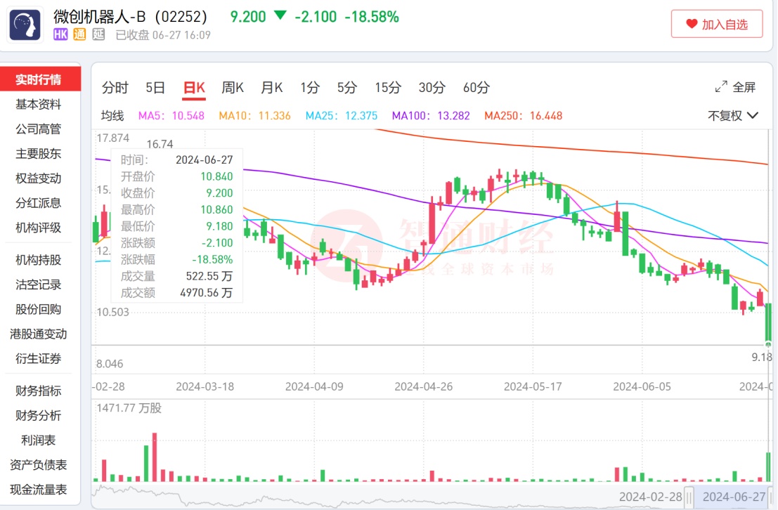 消息一出开盘后,微创机器人股价立即大跌,跌幅迅速突破15%直至收盘,当日最大跌幅达到18.76%%,股价跌至9.18港元,刷新其上市以来新低。若按股价折算,微创机器人相当于融资1.17亿元人民币,市值跌去20.3亿港元。