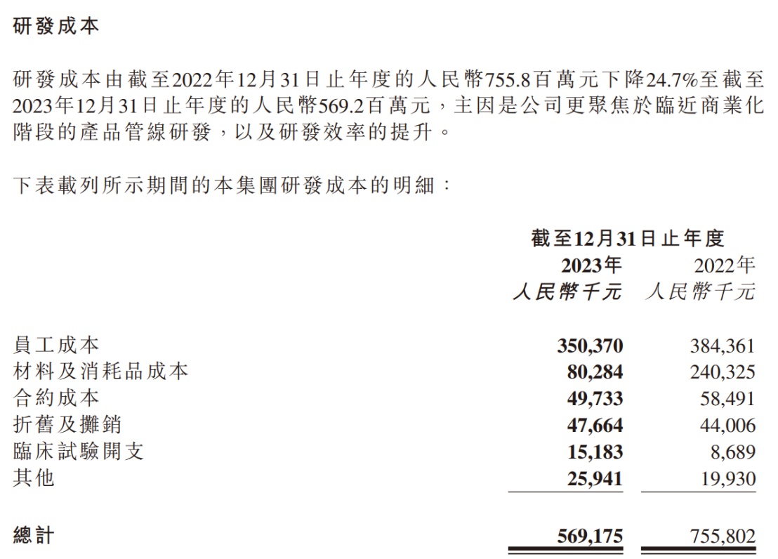 拆解其研发费用不难看到,微创机器人当期研发费用明细中下降最多的便是耗材成本,而作为占比最高的员工成本却未下降多少。但实际上,根据财报和公开信息,截至2022年末,微创机器人研发人员407人,但在2023年末仅剩238名。研发人员裁员近一半,员工成本仅下降8.8%,说明留下的已是其最核心的研发人员,再裁员恐影响其后续的产品研发和商业化进度。