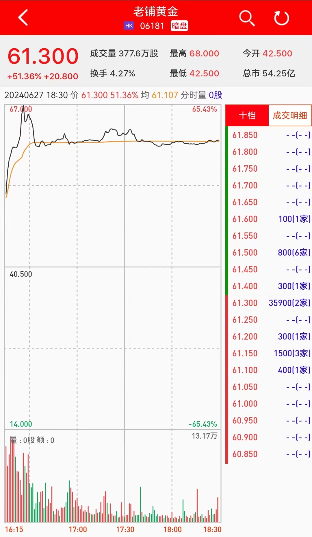 智通财经APP获悉,老铺黄金(06181)将于6月28日(周五)在香港挂牌。截至收盘,利弗莫尔证券暗盘交易显示报价61.3港元,较招股价40.5港元上涨51.36%。每手100股,不计手续费,每手赚2080港元。