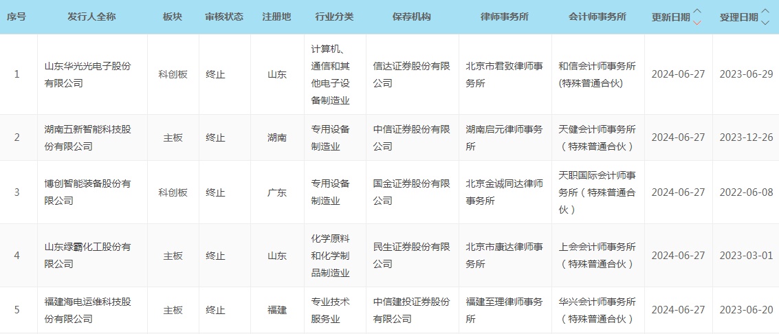 智通财经APP获悉,6月27日,山东绿霸化工股份有限公司(绿霸股份)、博创智能装备股份有限公司(博创智能)、湖南五新智能科技股份有限公司(五新科技)、山东华光光电子股份有限公司(华光光电)、福建海电运维科技股份有限公司(海电运维)上交所IPO审核状态变更为“终止”。