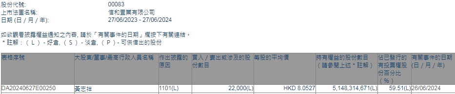 智通财经APP获悉,据香港联交所最新资料显示,6月26日,董事会主席黄志祥增持信和置业(00083)2.2万股,每股作价8.0527港元,总金额约17.72万港元。增持后最新持股数目约为51.48亿股,持股比例为59.51%。