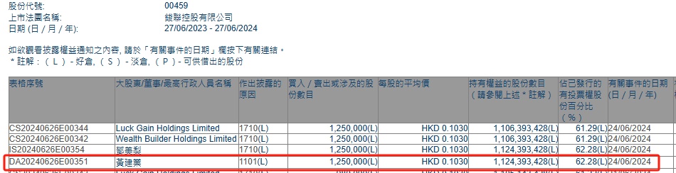 智通财经APP获悉,据香港联交所最新资料显示,6月24日,董事会主席兼执行董事黄建业增持鋑联控股(00459)125万股,每股作价0.103港元,总金额约10.09万港元。增持后最新持股数目为11.24亿股,持股比例为62.28%。