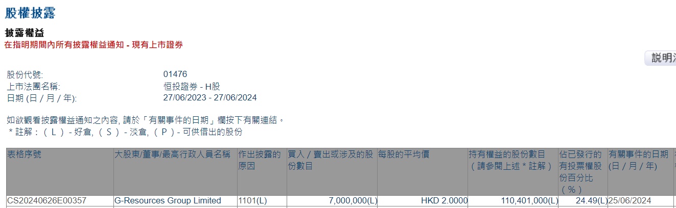 Limited增持恒投证券(01476)700万股,平均每股作价为2港元,总金额1400万港元。增持后最新持股数目约为1.10亿股,持股比例为24.49%。