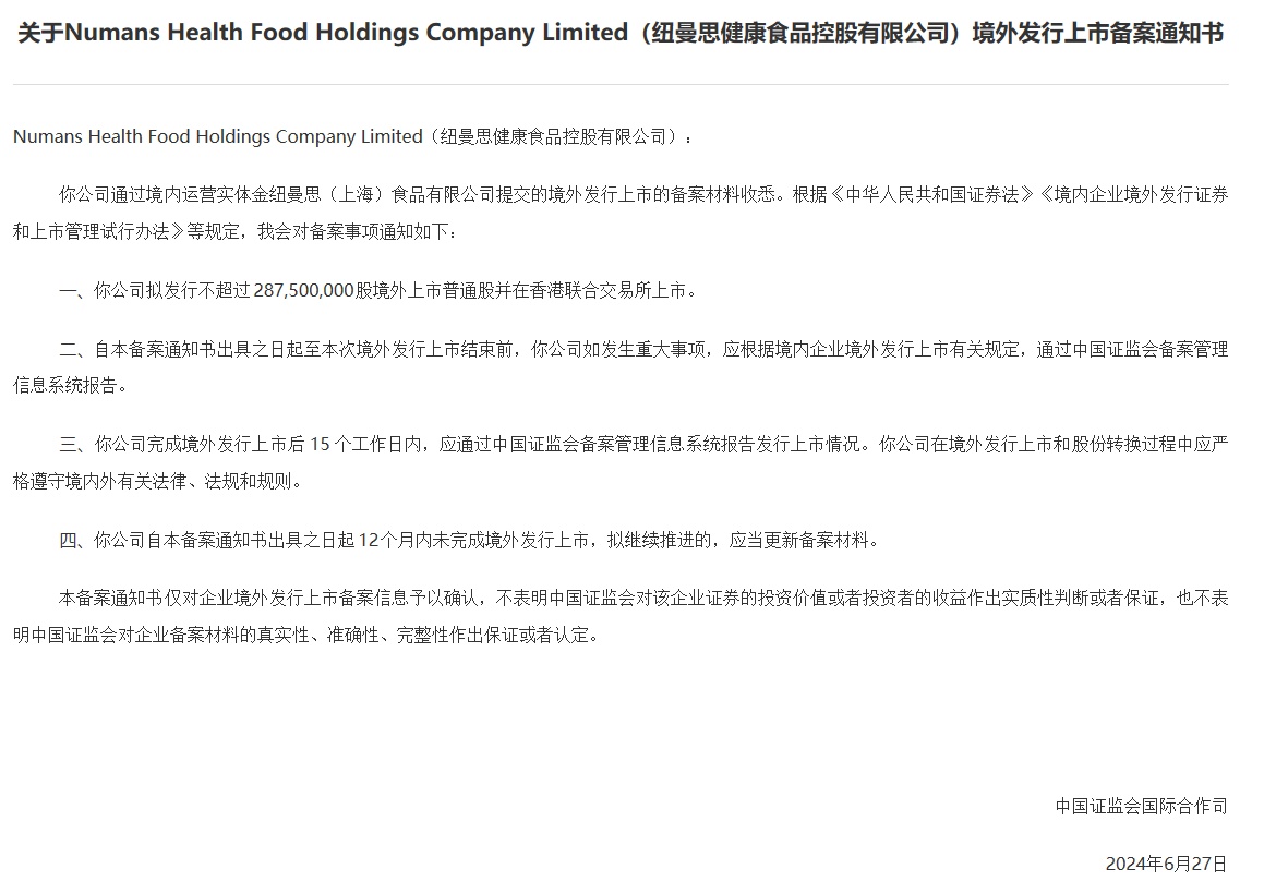 Limited(纽曼思健康食品控股有限公司)境外发行上市备案通知书》。该公司拟发行不超过287,500,000股境外上市普通股并在香港联合交易所上市。据港交所2023年12月29日披露,纽曼思递表港交所主板,财通国际融资有限公司为其独家保荐人。