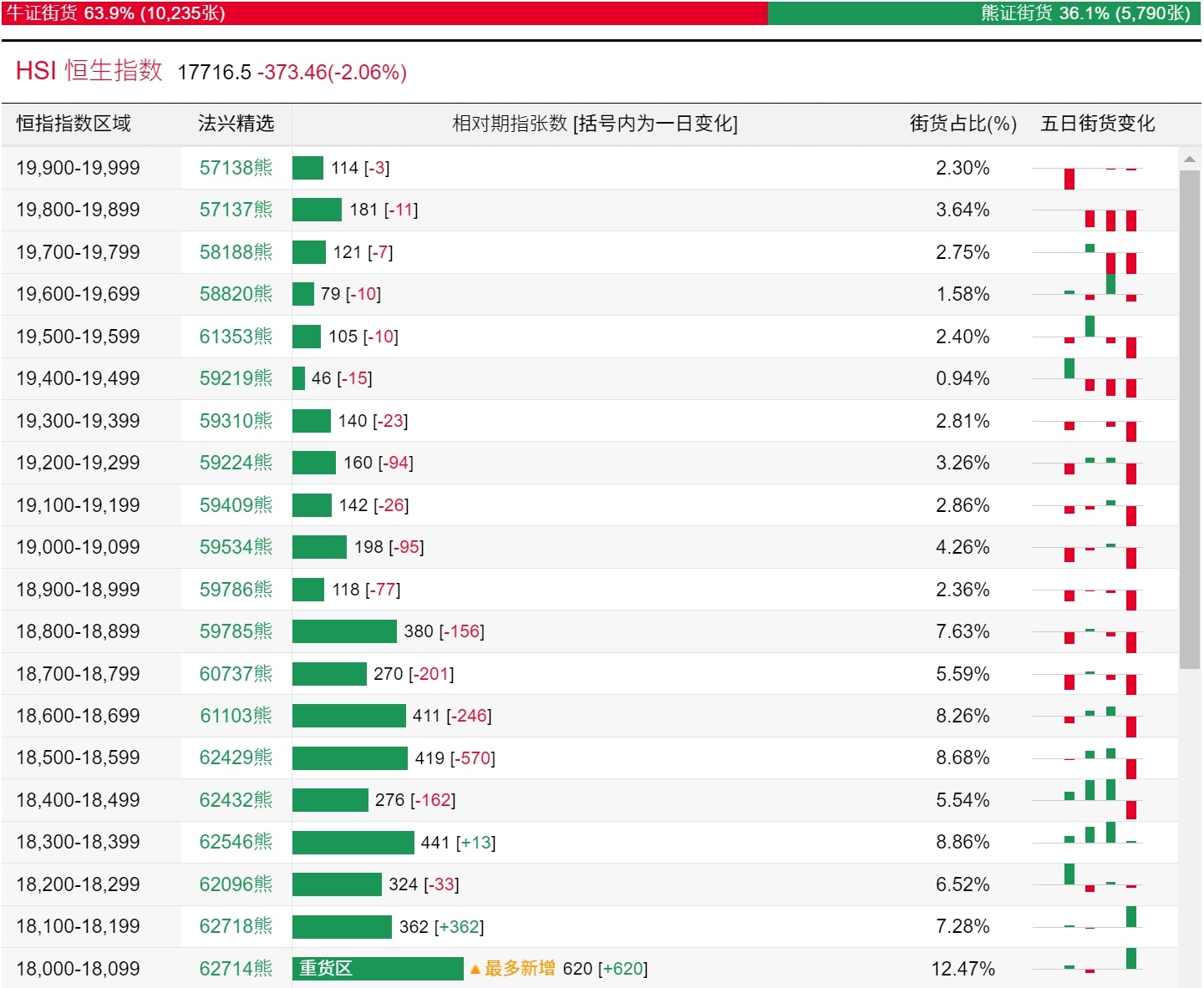 法兴恒指牛熊证街货分布图中的数据显示,熊证街货重货区和最多新增都在18000-18099区间,该区间最新熊证数量为620张,较上一交易日增加620张。