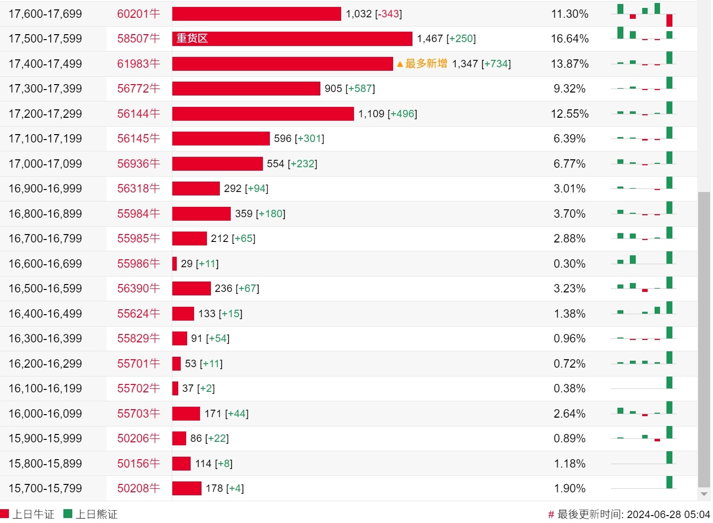 牛证街货重货区在17500-17599区间,该区间最新熊证数量为1467张,较上一交易日增加250张;最多新增在17400-17499区间,该区间最新牛证数量为1347张,较上一交易日增加734张。