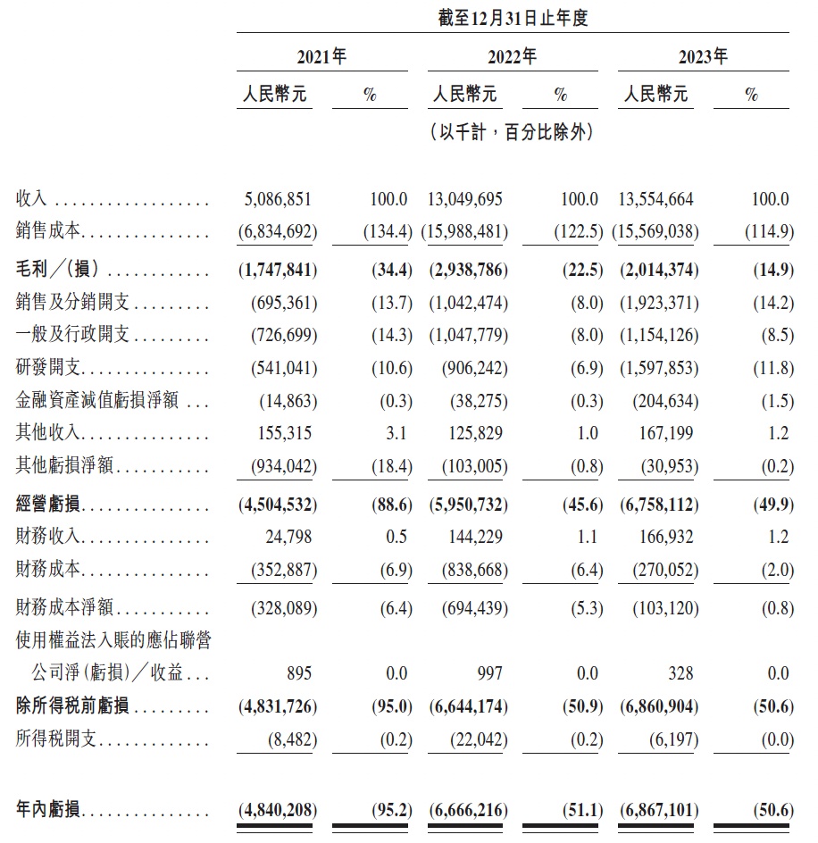 从哪吒汽车的招股书来看,2021-2023年公司实现收入50.87亿元、130.5亿元、135.55亿元,营收增长的“代价”是同期哪吒的亏损分别高达48.4亿元、66.66亿元、68.67亿元,三年合计亏损超过180亿元。