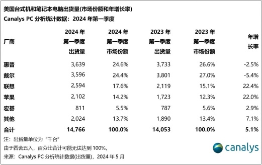 6月28日,研究机构Canalys发布的最新报告显示,2024年第一季度,美国个人电脑(PC)(不含平板电脑)出货量同比增长5%,达到1,480万台。增长的动力主要来自消费市场和中小型企业,两者在第一季度的出货量同比增长均超过9%。