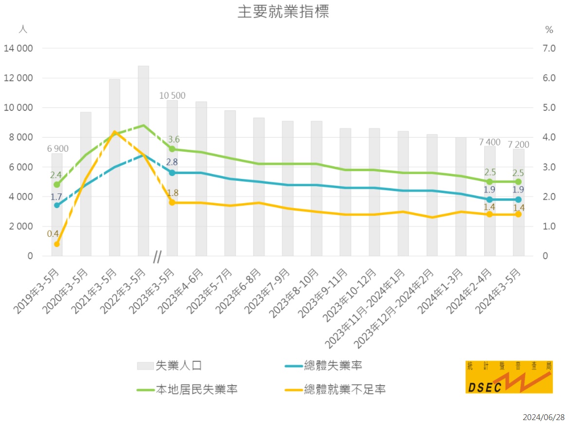 智通财经APP获悉,6月28日,澳门统计暨普查局资料显示,2024年3月至5月总体失业率(1.9%)及本地居民失业率(2.5%)在连续下跌两期后与上一期(2024年2月至4月)持平,两项指标已接近2019年同期水平;就业不足率(1.4%)亦维持在上一期水平。