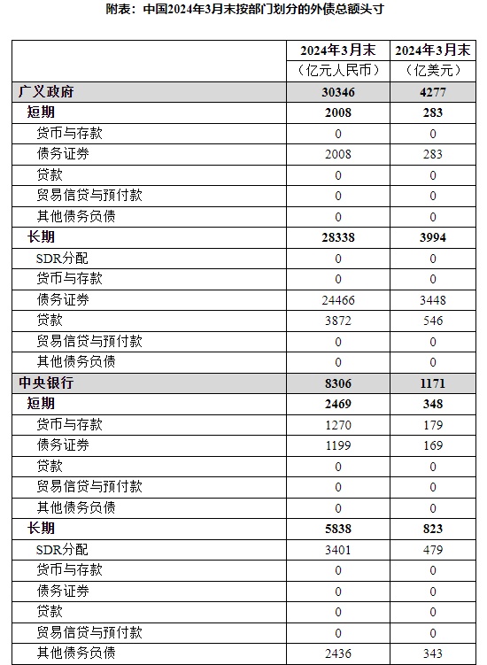 智通财经APP获悉,6月28日,国家外汇管理局公布2024年3月末中国全口径外债数据。截至2024年3月末,我国全口径(含本外币)外债余额为178270亿元人民币(等值25126亿美元,不包括中国香港特区、中国澳门特区和中国台湾地区对外负债,下同)。