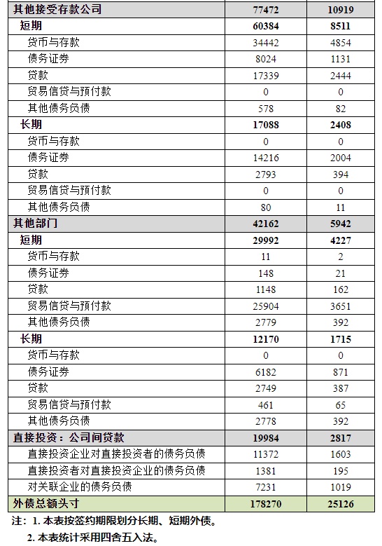 从机构部门看,广义政府外债余额为30346亿元人民币(等值4277亿美元),占17%;中央银行外债余额为8306亿元人民币(等值1171亿美元),占5%;银行外债余额为77472亿元人民币(等值10919亿美元),占43%;其他部门(含关联公司间贷款)外债余额为62146亿元人民币(等值8759亿美元),占35%。