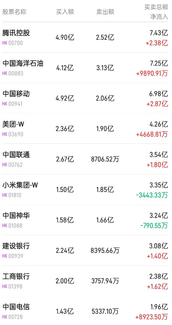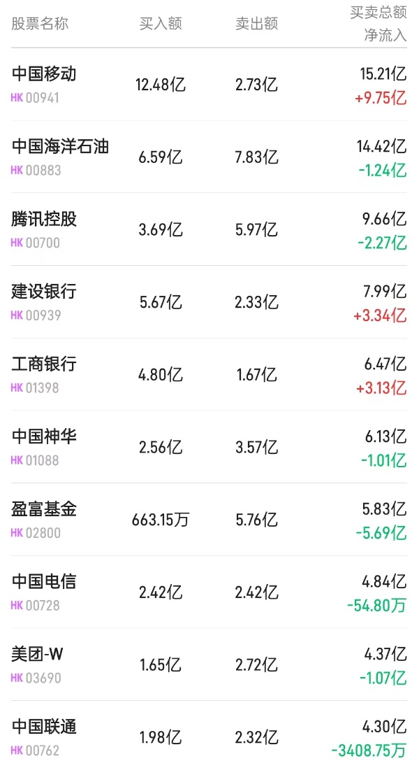 北水净买入最多的个股是中国移动(00941)、工商银行(01398)、建设银行(00939)。北水净卖出最多的个股是盈富基金(02800)、中国神华(01088)、中海油(00883)。