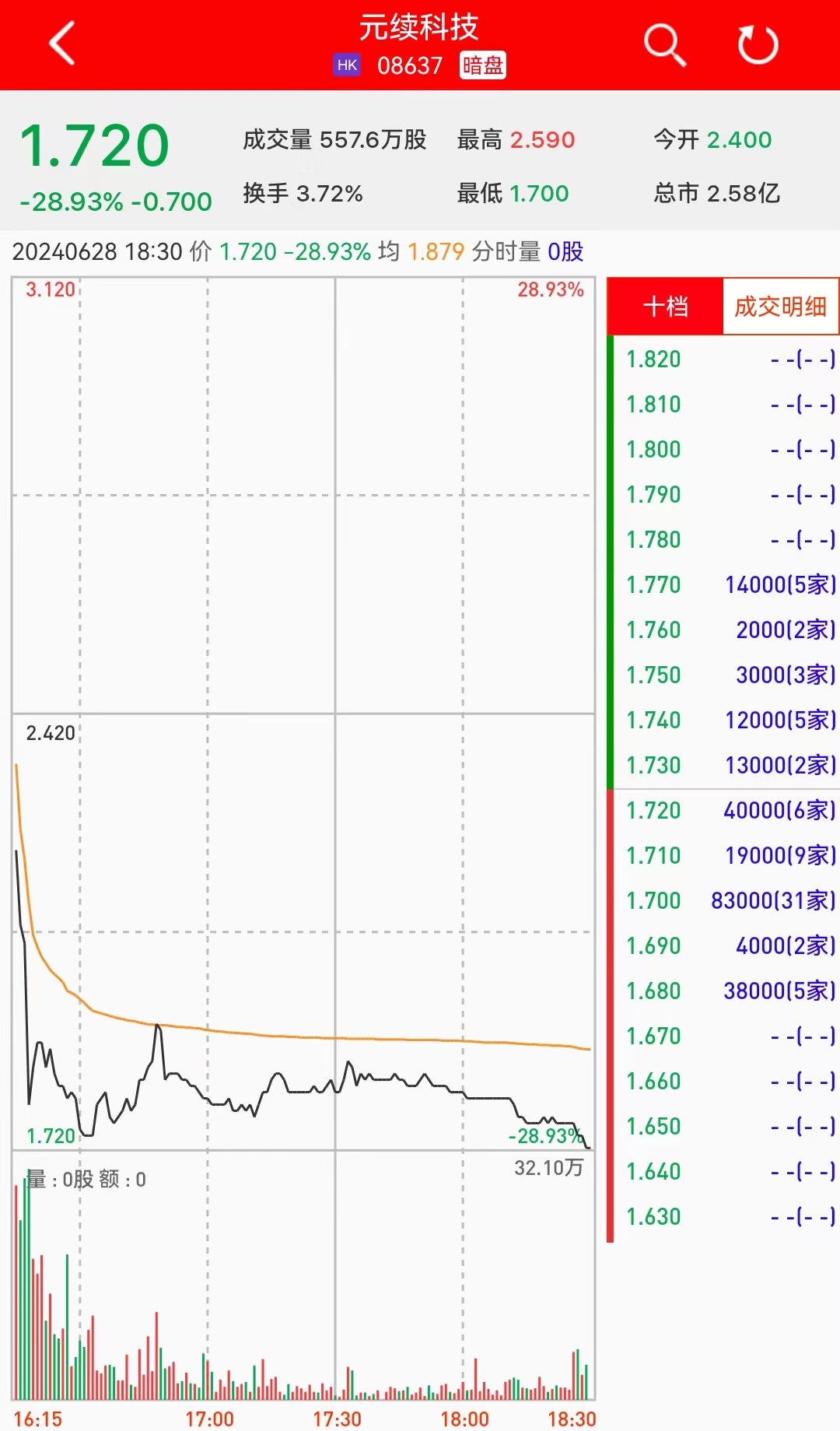 智通财经APP获悉,元续科技(08637)将于7月2日(周二)在香港挂牌。截至收盘,利弗莫尔证券暗盘交易显示报价1.72港元,较招股价2.42港元下跌28.93%。每手1000股,不计手续费,每手亏700港元。