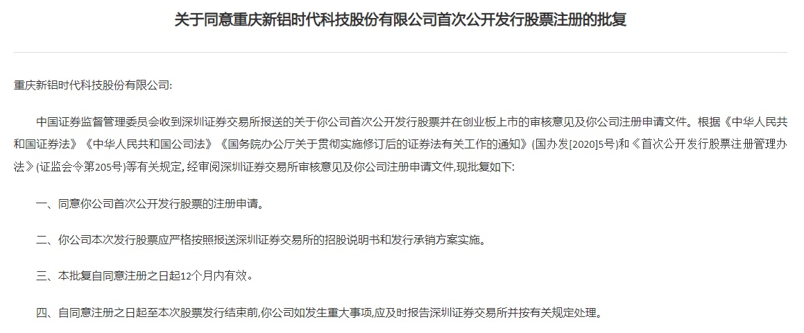 智通财经APP获悉,6月28日消息,证监会批复同意重庆新铝时代科技股份有限公司(简称:新铝时代)于深交所创业板首次公开发行股票注册。