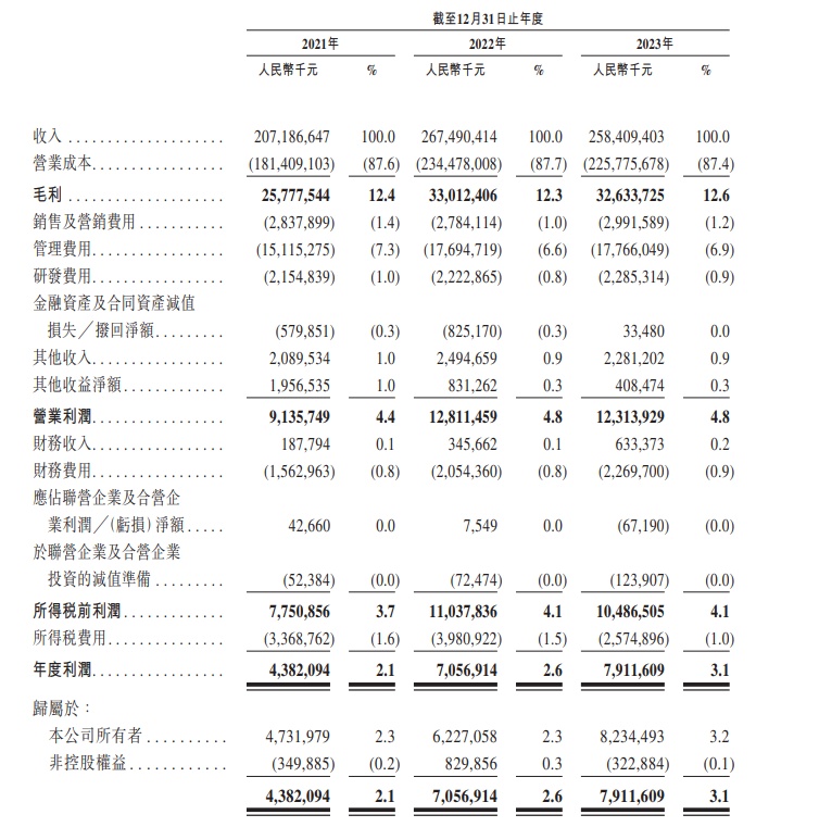 财务方面,于2021年度、2022年度、2023年度,公司实现收入分别为人民币2071.87亿元、2674.90亿元、2584.09亿元;期内利润分别约为人民币43.82亿元、70.57亿元、79.12亿元。