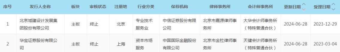智通财经APP获悉,6月28日,华宝证券股份有限公司(华宝证券)、北京城建设计发展集团股份有限公司(城建设计)上交所IPO审核状态变更为“终止”。