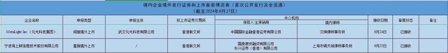 智通财经APP获悉,6月28日,中国证监会发布《境内企业境外发行证券和上市备案情况表(首次公开发行及全流通)(截至2024年6月27日)》。本周(6月24日-28日),元光科技、海上鲜等公司拟香港IPO获中国证监会接收材料。