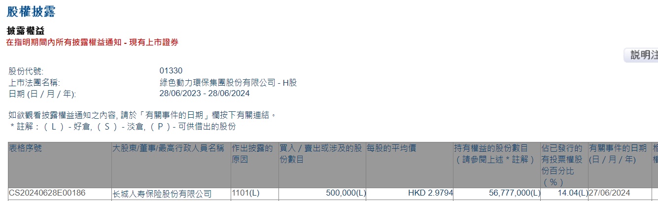 智通财经APP获悉,香港联交所最新资料显示,6月27日,长城人寿保险股份有限公司增持绿色动力环保(01330)50万股,每股作价2.9794港元,总金额约148.97万港元。增持后最新持股数目为5677.7万股,最新持股比例为14.04%。