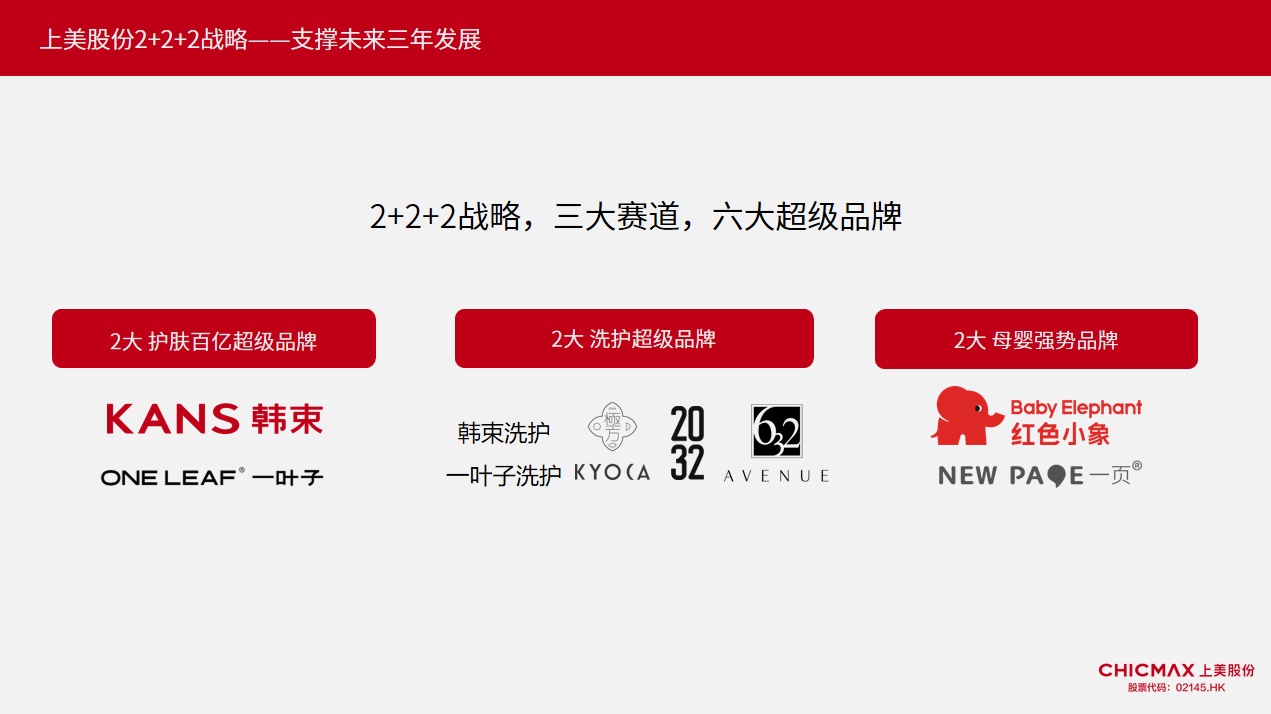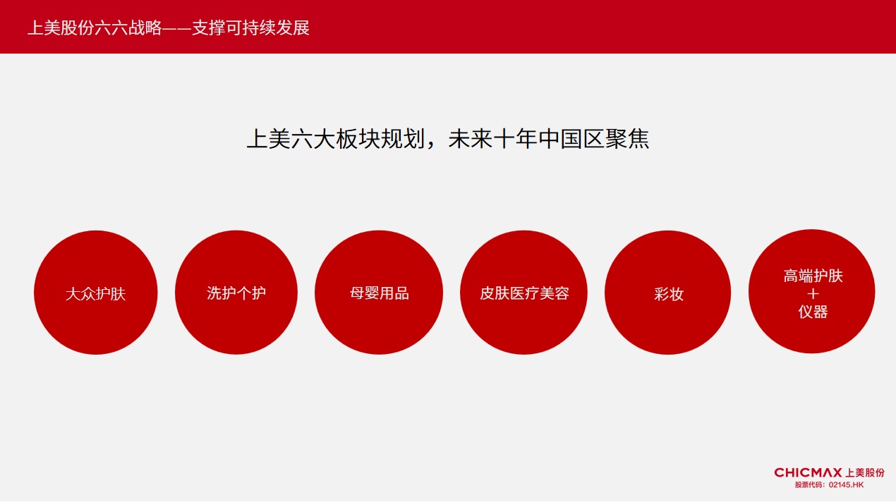 根据2+2+2战略,未来3年,上美将聚焦护肤、洗护、母婴三大赛道。根据六六战略,未来10年,上美中国区将聚焦大众护肤、洗护个护、母婴用品、皮肤医疗美容、彩妆、高端护肤+仪器六大板块。