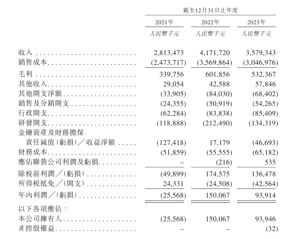 财务方面,于2021年度、2022年度及2023年度,公司的收入分别约为人民币28.13亿元、41.72亿元及35.79亿元;同期,公司的年内利润分别约为人民币-2556.8万元、1.50亿元及9391.4万元。