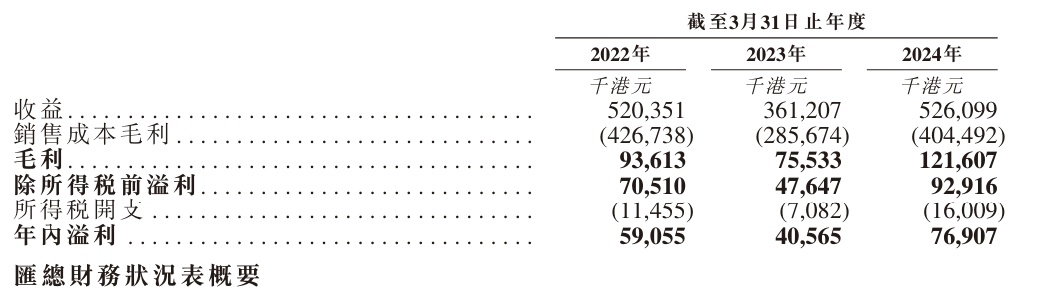 财务方面,于2022年、2023年及2024年截至3月31日止年度,公司的收入分别约为5.20亿港元、3.61亿港元及5.26亿港元;同期,公司的年内利润分别约为5905.5万港元、4056.5万港元及7690.7万港元。