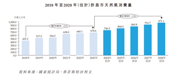对于在河南省深耕,以销气为主业的五洲能源而言,拥有30年特许经营权无疑是其保有稳定经营20年的“定海神针”。弗若斯特沙利文报告显示,未来,许昌市天然气消费量预计将持续增加并于2028年达到9.71亿立方米,自2023年起的复合年增长率为7.4%。