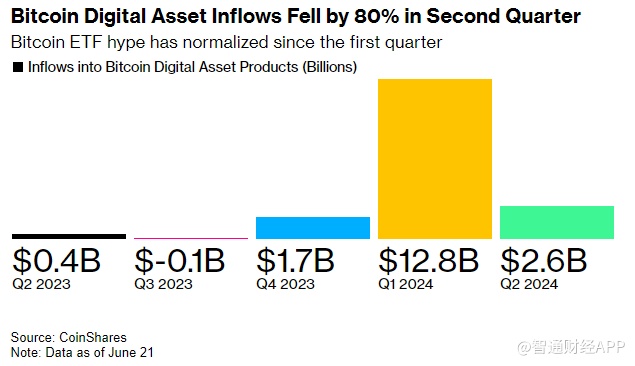 CoinShares汇编的数据显示,第二季度,投资者向比特币基金投入了约26亿美元,而今年前三个月的投资额约为130亿美元。