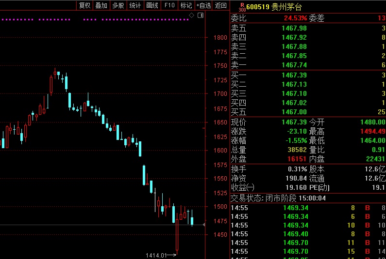 此外,飞茅价格跳水,二级市场也难逃回调。5月8日起,贵州茅台股价一路下挫,6月24日,股价一度跌至1414.01元,期间总市值缩水3600多亿元。不过,6月24日见底后,市场情绪随着稳价措施有所回暖,贵州茅台股价企稳回涨。
