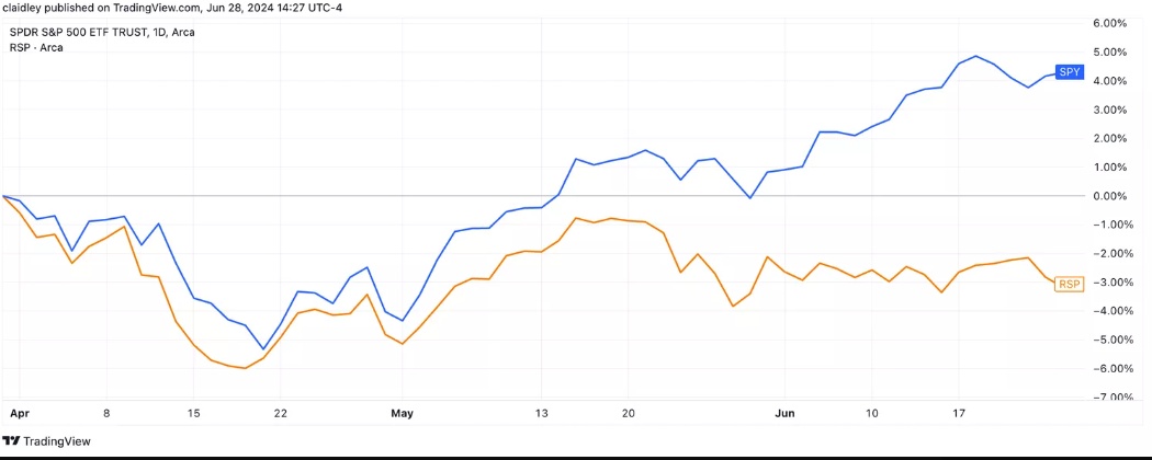 以下这一组数据可谓形成鲜明对比:按照总计市值加权测算的标普500指数——这也是市面上多数ETF所跟踪的标普500指数,在第二季度上涨4%,并且有九次收于历史最高点。然而,等权重版本的标普500指数——即英伟达、谷歌和微软在指数中的权重占比相同,较第一季度末的历史最高点意外下跌3.1%。