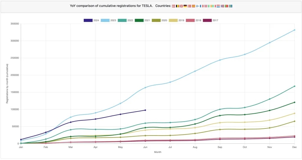 按地区划分,特斯拉在欧洲市场的问题似乎尤为严重。根据注册量追踪器的数据,与2023年创纪录的一年相比,今年特斯拉的交付量已经减少了6万多辆。由于大部分差距发生在过去几个月,因此特斯拉第二季度在欧洲市场将非常艰难。