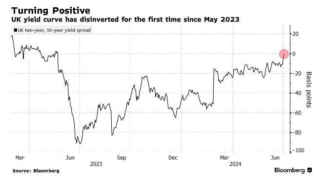 智通财经APP获悉,困扰英国债券市场一年多的异常情况于周一结束,10年期国债收益率回升至两年期国债上方。这表明英国的债券市场恢复了正常状态,也说明投资者正在消化扭曲利率市场的紧缩货币政策时代的结束。