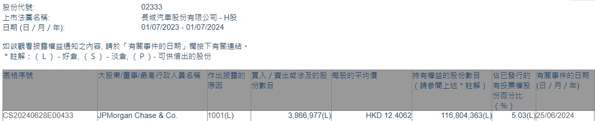 智通财经APP获悉,香港联交所最新资料显示,6月25日,小摩增持长城汽车(02333)386.6977万股,每股作价为12.4062港元,总金额约为4797.45万港元。增持后最新持股数目约为1.17亿股,持股比例为5.03%。