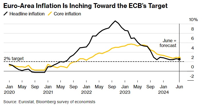 欧元区6月消费者价格数据将于周二公布,经济学家预计CPI涨幅将从2.6%放缓至2.5%,显示出向2%的目标迈进了一小步。