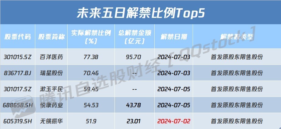 从解禁比例来看,未来五日百洋医药实际解禁比例达77.38%,其次解禁比例居前的分别为瑞星股份和漱玉平民。