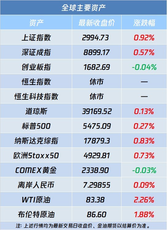 自选哥提示:隔夜美股三大指数集体收涨,纳指再创收盘新高,特斯拉大涨逾6%。其他市场方面,COMEX黄金期货跌0.03%,报2338.9美元/盎司;纽约商品交易所7月交货的轻质原油期货收于每桶83.38美元,涨幅为2.26%。