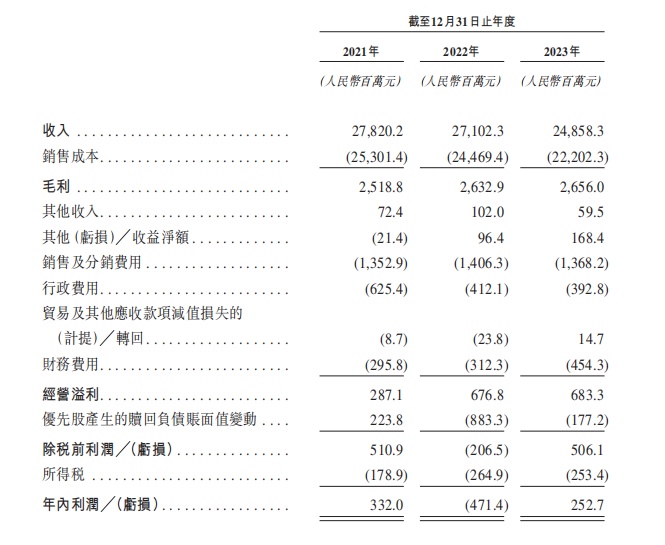 尽管作为食品快消供应链解决方案龙头,但麦德龙供应链的营收却不好看。2021年至2023年(以下简称:报告期内),公司的营收分别为278.2亿元(单位:人民币,下同)、271.02亿元、248.58亿元,连续下降,三年年复合增长率为-5.47%。