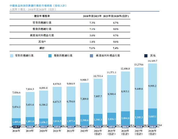 根据弗若斯特沙利文的资料,按收入计,中国食品快消供应链行业的市场规模由2018年的人民币70,366亿元增至2023年的人民币99,007亿元,复合年增长率为7.1%,预计在2023年至2028年间将以7.4%的复合年增长率持续增长,到2028年,市场规模预计将达到人民币141,497亿元。