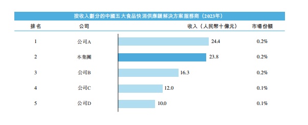 根据弗若斯特沙利文的资料,按2023年的收入计,麦德龙供应链在中国的行业地位如下:公司为第二大食品快消供应链解决方案服务商;第二大零售供应链解决方案服务商;第五大餐饮供应链解决方案服务商及最大团餐供应链解决方案服务商;及第二大商业福利和礼品解决方案服务商。