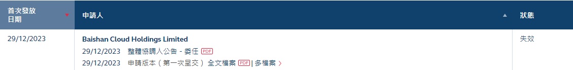 智通财经APP获悉,白山云控股有限公司(简称“白山云”)于2023年12月29日递交的港股招股书满6个月,于6月29日失效,递表时中金公司、海通国际为其联席保荐人。