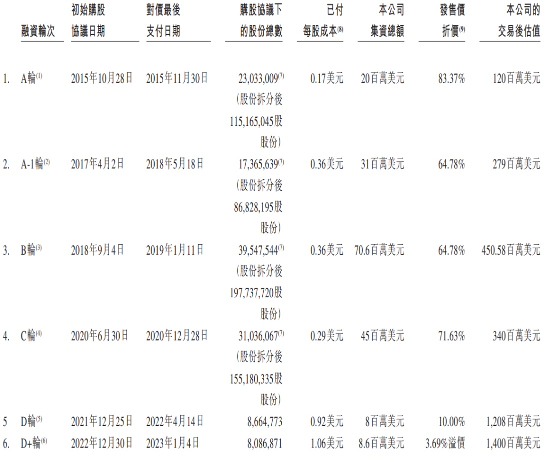 公司IPO前总共完成6轮融资,最后D+轮融资完成于2023年1月4日,公司估值14亿美元,约合109.31亿港元,每股成本1.06美元,约合8.27元港元,较发售价溢价3.69%,IPO前投资者禁售期6个月。