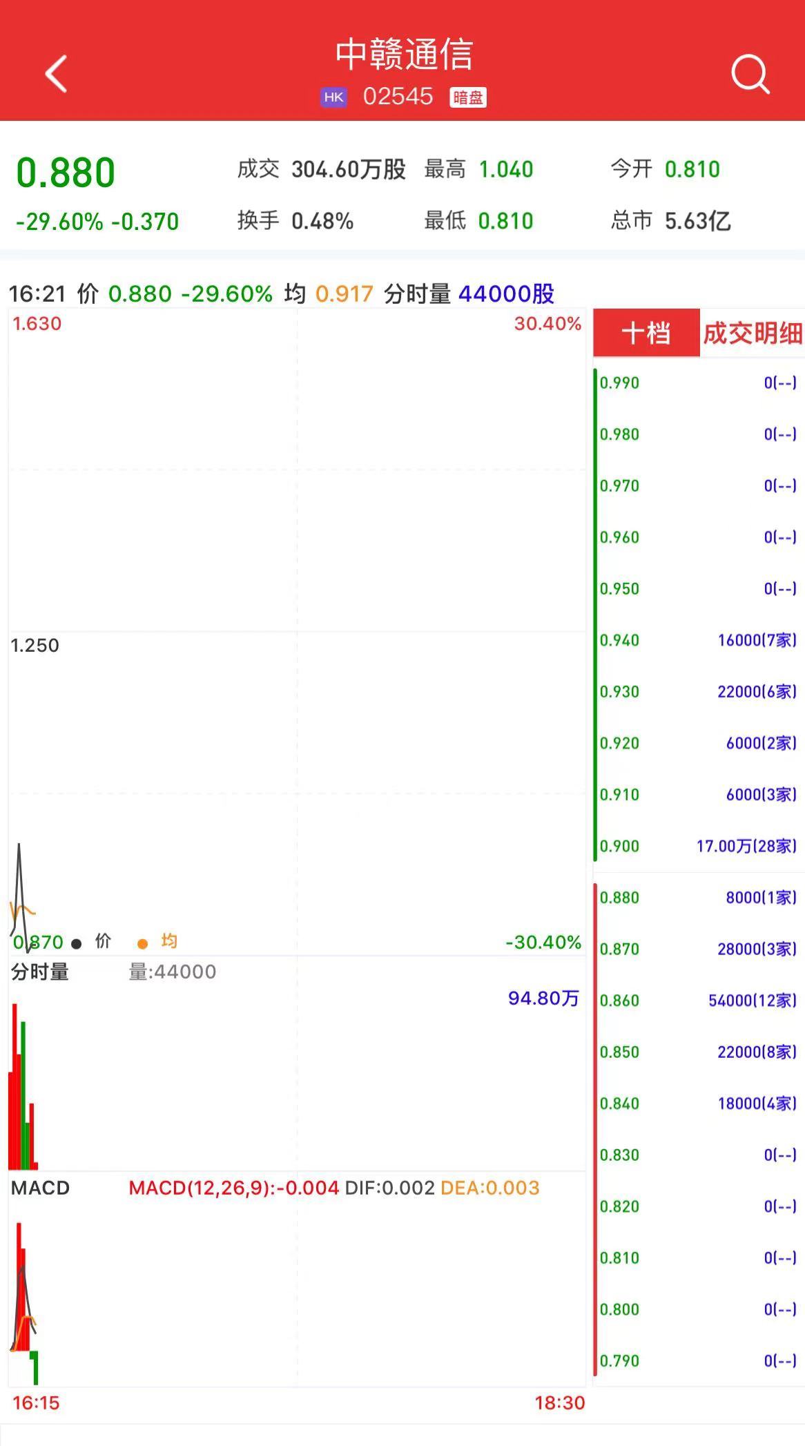 智通财经APP获悉,中赣通信(02545)将于7月3日(周三)在香港挂牌。截至发稿,利弗莫尔证券暗盘交易显示报价0.88港元,较招股价1.25港元跌29.6%。每手2000股,不计手续费,每手亏740港元。