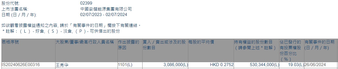 智通财经APP获悉,香港联交所最新资料显示,6月26日,股东王秀华增持中国安储能源(02399)308.6万股,平均每股作价0.2752港元,总金额约为84.93万港元。增持后最新持股数目约为5.30亿股,持股比例为19.03%。