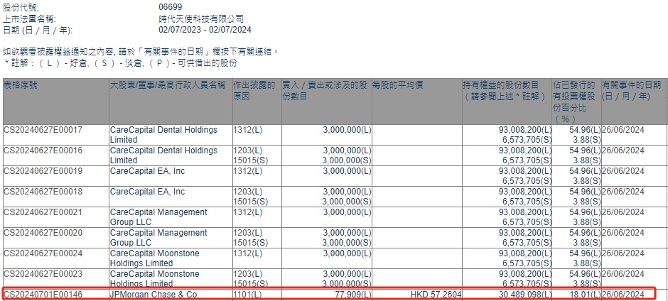 智通财经APP获悉,香港联交所最新资料显示,6月26日,摩根大通增持时代天使(06699)7.7909万股,每股作价57.2604港元,总金额约为446.11万港元。增持后最新持股数目约为3048.91万股,最新持股比例为18.01%。