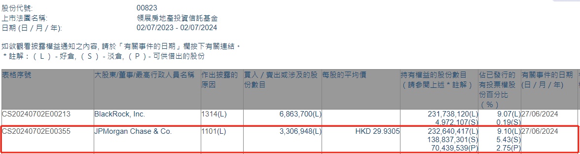 智通财经APP获悉,香港联交所最新资料显示,6月27日,小摩增持领展房产基金(00823)330.6948万股,每股作价29.9305港元,总金额约为9897.86万港元。增持后最新持股数目约为2.33亿股,最新持股比例为9.10%。