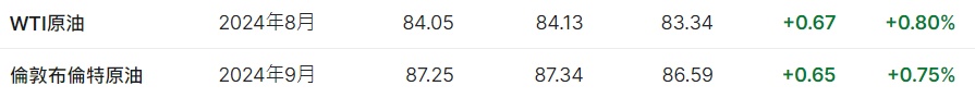 3. 截至发稿,WTI原油涨0.80%,报84.05美元/桶。布伦特原油涨0.75%,报87.25美元/桶。